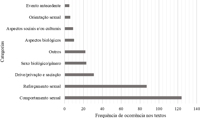 As palavras e expressões em que o radical sex estava contido foram agrupadas em nove diferentes categorias, que, de maneira geral, representam as discussões sobre sexualidade realizadas por Skinner. É importante ressaltar que a divisão das categorias foi didática e em alguns casos as discussões se entrelaçam, como é o caso da divisão entre “Comportamento Sexual” e “Reforçamento Sexual”, que podem se unir na medida em que um comportamento pode ser definido por suas consequências reforçadoras. Outro exemplo pode ser observado na categoria “Drive/privação e saciação”, que poderia ser uma parte da categoria “Aspectos Biológicos”, por envolver aspectos da história filogenética. A Figura 2 apresenta a frequência total de cada categoria na obra pesquisada e a Tabela 2 apresenta os termos inseridos em cada categoria.