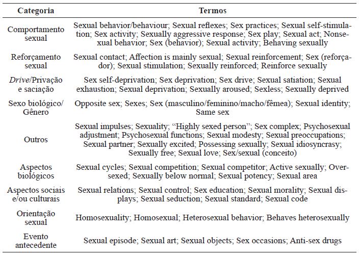 Na categoria “Outros” foram incluídas quaisquer palavras ou expressões que não se encaixavam nas outras categorias ou que não eram suficientes para constituírem uma categoria adicional. Assim, alguns dos termos foram referentes a teses tradicionais que estavam sendo criticadas por Skinner (1953/2005, 1969, 1971, 1987), teses essas que se amparam em noções internalistas da sexualidade, representadas por termos como: “sexual impulses”, “sex complex”, “psychosexual functions”, e “possessing sexually”. Outros termos dessa categoria se relacionam com descrições de Skinner (1957, 1974, 1989) a respeito de sentimentos e emoções, como “sexually excited” e “sexual love”. Aqui também foi incluído o termo amplo “sexuality” que apareceu duas vezes na obra, sendo utilizado como sinônimo de drive sexual em Contingencies of Reinforcement (1969) e como sinônimo de comportamento sexual em Upon Further Reflection (1987).