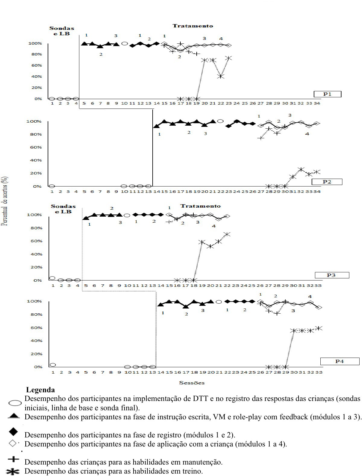P4, de acordo com o delineamento de sondas múltiplas, realizou duas sessões de sondas iniciais, sendo a primeira simultaneamente à sonda inicial de P3, e a segunda, após P3 alcançar o critério na primeira fase do treino (instrução escrita, VM e role-play com feedback). O desempenho de P4 em todas as sondas e sessões de linha de base foi de 0%. Durante as sessões de instrução escrita, VM e role-play com feedback, P4 alcançou o critério no desempenho em sete sessões. Houve a necessidade de uma nova sessão do Módulo 1, especificamente para o operante tato; no Módulo 2, houve a necessidade de uma nova sessão para o operante “imitação”; no Módulo 3, o participante precisou de mais uma sessão para o operante tato. Embora P4 tivesse uma maior exposição ao treino, de forma semelhante à P2, o percentual de integridade de seu desempenho sempre permaneceu alto, variando entre 92% e 100% ao longo das sessões (98% em média). Na sonda final, o desem- penho de P4 foi de 99%. Durante a fase de registro, alcançou o critério estabelecido em quatro sessões (100% em todas as sessões). Durante a fase de intervenção com a criança, o critério de desempenho foi alcançado em oito sessões. Durante toda as fases de treinamento, o desempenho de P4 se manteve estável, variando entre 90% e 100% de acerto (98% em média). O desempenho de C1, quando recebeu intervenção de P4, na aplicação de programas em manutenção, variou de 89% a 100% (95% em média); o de C2, para os programas que estavam em treino, variou de 56% a 59% (56% em média).