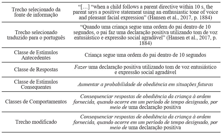 Quanto aos procedimentos realizados, entre as primeiras informações coletadas nas fontes de informação, foi possível identificar, frequentemente, objetivos descritos apenas como classes de respostas, como “fazer uma declaração positiva com tom de voz entusiástico e expressão facial agradável” (Hansen, 2017b). Informações como essa não forneciam dados sobre as variáveis antecedentes e consequentes que controlariam a resposta de realizar uma declaração positiva. De acordo com Botomé (1980), os comportamentos que serão ensinados precisam ser descritos a partir da interação entre seus componentes (variáveis antecedentes, respostas e variáveis consequentes). Logo, do trecho retirado de Hansen (2017b), foram derivados outros componentes de modo a descrever o comportamento como “Consequenciar respostas de obediência da criança à ordem fornecida por meio de elogio ou agradecimento”.