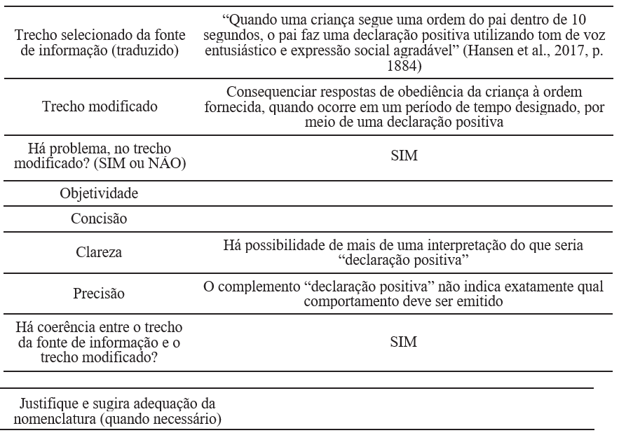 A partir dessa avaliação, foram propostas novas versões para os nomes dos comportamentos, que foram registradas na última coluna do Protocolo A (Tabela 1). Os trechos que indicavam comportamentos muito específicos (e.g., “pedir que a criança pegasse um item no chão”) foram modificados para que abrangessem situações mais amplas (e.g., “pedir que a criança realizasse uma tarefa específica”). Um exemplo do Protocolo A após a realização das Etapas 1 e 2 consta na Tabela 1. A Etapa 3 foi realizada por uma juíza externa, analista do comportamento, pesquisadora da área e com conhecimento sobre o procedimento da PCDC. A juíza utilizou os critérios identificados por Danna e Matos (2006) descritos acima para avaliar os dados do Protocolo A. No Protocolo B (Tabela 2), a juíza registrou se havia algum problema com relação a algum desses critérios, justificando os problemas encontrados.