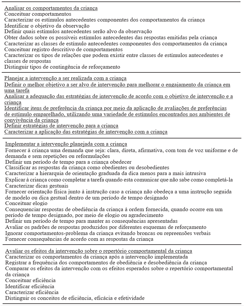 As fontes de informação iniciais forneceram, predominantemente, informações sobre a classe de comportamentos “implementar a intervenção com a criança”. Uma busca no estudo de Teixeira (2010) e a realização do procedimento de decomposição de comportamentos complexos permitiram a identificação e derivação de outras classes de comportamentos que parecem ser pré-requisito para a aprendizagem da classe geral “promover a aprendizagem de comportamentos de obediência em crianças com TEA”.