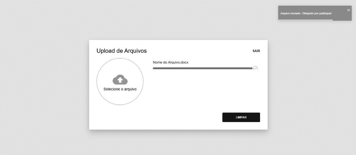 Na plataforma, havia duas interfaces: a referente à fase linha de base; e a referente à fase experimental. Na primeira, havia apenas a possibilidade de envio do arquivo, sem nenhum tipo de feedback (Figura 1). Após ele realizar a postagem, a plataforma exibia a seguinte mensagem de confirmação: “Arquivo enviado. Obrigado por participar!”.
