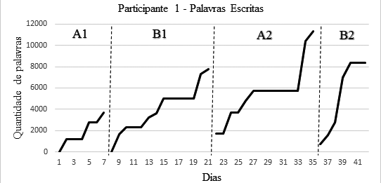 No que diz respeito à quantidade de palavras escritas, como observado na Tabela 1 e na Figura 4, a fase em que a Participante mais escreveu palavras foi em A2 (10227), sendo observado um pico de produção, com 4709 palavras, que ocorreu após um período de seis dias entre as respostas (respectivos aos dias 27-33), o maior durante toda a pesquisa. Com o retorno à condição B, a Participante obteve o maior período de produção por tempo, uma vez que sua duração foi de uma semana, com 8341 palavras, mais que o dobro do que se obteve em A1. Ao compararmos as taxas, observou-se um aumento de 126,60% (A1-B2) em B2 e 31,29% (A2-B1) em A2.