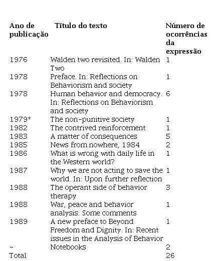 Outros dois textos que não apareceram nos livros foram adicionados, considerando leituras anteriores que tinham revelado a presença de discussões sobre controle face a face. Estes artigos são: ‘War, peace and Behavior Analysis: Some comments’ (Skinner, 1988b) e ‘The non-punitive society’ (Skinner, 1990).