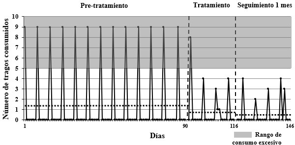 Debido a que el consumo de alcohol en los bebedores problema tiende a ser más bien episódico en lugar de constante, existe una variabilidad considerable respecto a los datos, con periodos prolongados de consumo nulo y días de consumo significativo. Sin embargo, se puede considerar que la línea base presenta una estabilidad, debido a que es posible apreciar un patrón de consumo episódico cíclico sin variaciones importantes en el número de tragos ingeridos por día. Por su parte, la fase de intervención muestra una tendencia de una disminución del número de tragos consumidos por ocasión en relación con la línea base. Lo anterior puede corroborarse en la media de tragos ingeridos por día durante la línea base (1.3 tragos) y la media de la fase de intervención (0.81 tragos), indicando una reducción en el consumo de un 37.69%. La continuación de esta tendencia puede apreciarse en la fase de los 30 días posteriores al tratamiento, donde el promedio de consumo bajó a 0.53 tragos por día, una reducción de un 34.57% en comparación con la fase de tratamiento, y un 59.23% en comparación con la fase de pre-tratamiento.