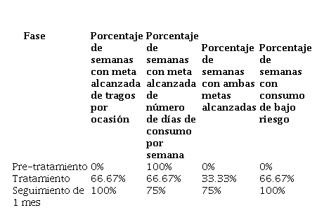 A partir de dicha tabla, puede apreciarse que el único indicador cumplido durante la fase de pre-tratamiento era el de un día de consumo semanal de los objetivos planteados (100% de las semanas); sin embargo, es importante destacar que dicho consumo fue consistentemente excesivo (9 tragos consumidos en cada ocasión). Durante la fase de tratamiento, el consumo presentó una disminución respecto a la fase anterior, debido a que la mayoría de las semanas (66.67%) presentaron una ingesta de un máximo de 4 tragos por ocasión y una ocasión de consumo por semana; asimismo, se presentó una semana en la que ambos objetivos fueron alcanzados (33.33%), y la mayoría de las semanas comenzó a presentar un consumo de bajo riesgo (66.67%). Finalmente, durante el mes de seguimiento, todas las semanas cumplieron con el objetivo del número de tragos por ocasión, y la mayoría tenía solamente una ocasión de consumo (75%). Adicionalmente, aumentó el porcentaje de semanas en los que se cumplieron ambas metas (75%). Por último, es importante destacar que todas las semanas cumplieron con los criterios de una ingesta de bajo riesgo durante el mes de seguimiento.