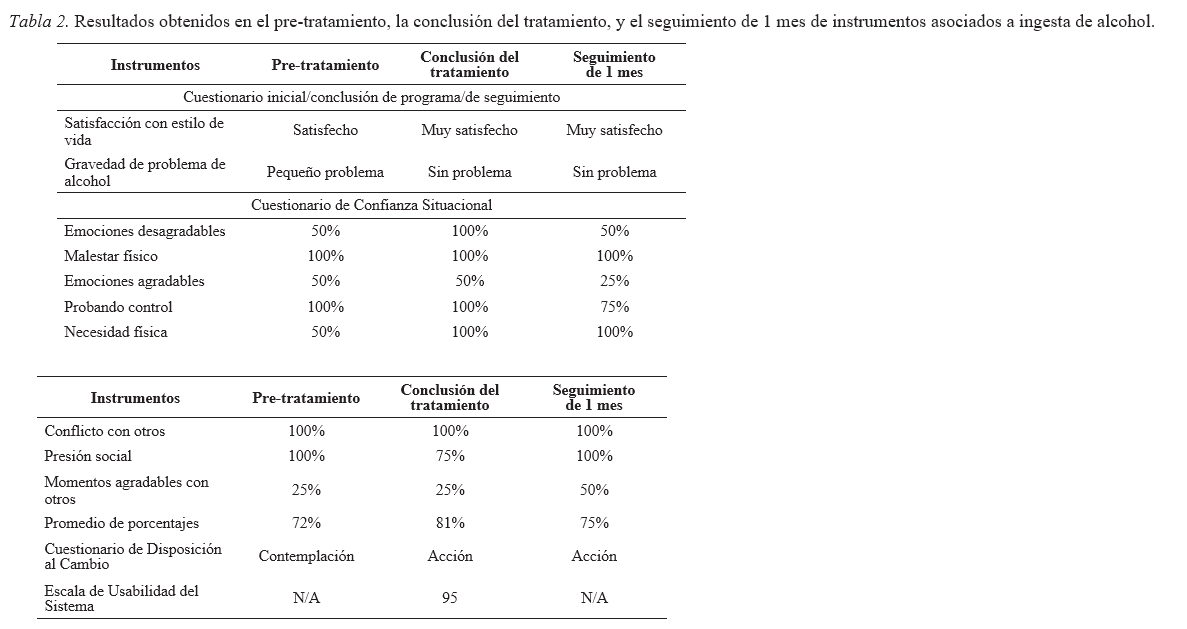 Puede apreciarse que hay indicadores de un impacto favorable de la intervención en algunas de las medidas recolectadas. Por ejemplo, el consumo de alcohol dejó de ser percibido como un problema después de la aplicación de la intervención, y dicha percepción se mantuvo en el seguimiento a 1 mes. Asimismo, se presentó un avance en la fase de cambio, debido a que el Cuestionario de Disposición al Cambio indica que ocurrió una transición del sentimiento de ambivalencia respecto a la implementación de un cambio (contemplación) a cambios concretos para lograrlo (acción) en la etapa de la intervención, manteniéndose en el seguimiento de 1 mes. Además, hubo un aumento en la satisfacción con el estilo de vida, tanto durante el programa como después de 1 mes de su conclusión. y la evaluación de la usabilidad del programa fue extremadamente favorable (valor de 95). El único indicador que presentó un resultado más ambivalente fue el de la percepción de autoeficacia, ya que el promedio de los porcentajes de las ocho situaciones de riesgo aumentó durante el programa, pero disminuyó durante el seguimiento, aunque no bajó al nivel de pre-tratamiento.