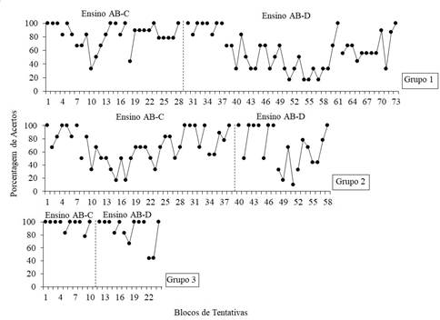 Conforme dados da Figura 1, o participante alcançou critério de aprendizagem em 28 blocos (192 tentativas) para as relações AB-C e em 44 (291 tentativas) para as relações AB-D com os estímulos do primeiro conjunto, totalizando 72 blocos (483 tentativas). Para os estímulos do segundo conjunto, foram 38 blocos (231 tentativas) para as relações AB-C e 19 (126 tentativas) para as relações AB-D, totalizando 57 blocos (357 tentativas). Para os estímulos do terceiro conjunto, foram 10 blocos (57 tentativas) para as relações AB-C e 13 (78 tentativas) para as relações AB-D, totalizando 23 blocos (135 tentativas). Ressalta-se que o maior número de tentativas para alcance de critério foi nos blocos 5, 7 e 8 (ver Tabela 4), em que havia randomização da apresentação dos estímulos modelos ou maior número de estímulos de comparação. Por outro lado, na maioria dos blocos em que o modelo era fixo, o participante alcançou critério na primeira apresentação.