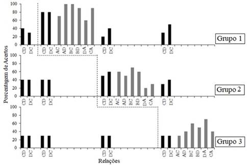 Para o conjunto 2, apesar do desempenho para as relações CD e DC ter melhorado de 40% para 50% (CD) e 60% (DC), esse desempenho, mesmo acima do nível do acaso (considera-se nível do acaso 33% de respostas corretas, pois se o participante responder por posição ou por preferência de estímulo, ele terá três acertos em nove tentativas), fica abaixo do critério mínimo para que se considere que houve aprendizagem (pelo menos 80% de acertos). O mesmo pode ser verificado para as outras relações testadas, sendo que o participante apresentou 70% de acertos para a relação BC e 60% para as relações AC e BD. Para o conjunto 3, nota-se que o desempenho não alterou entre linha de base e teste para as relações transitivas, mas o participante apresentou 70% de acertos para a relação BA e 60% para a relação BC.