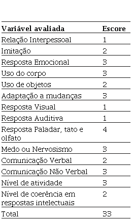 O participante foi um menino de 6 anos de idade, com diagnóstico de TEA, regularmente matriculado na primeira série do ensino fundamental público. Para este estudo, foi utilizada a escala CARS (do inglês Childhood Autism Rating Scale; Schopler et al., 1986; traduzido para o Brasil por Pereira et al., 2008), em entrevista com a mãe. As pontuações podem ser encontradas na Tabela 1. A pontuação total foi de 33, o que coloca o participante no grau leve-moderado de TEA.