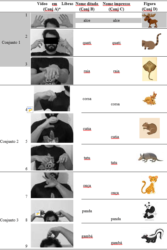 Para a seleção dos estímulos, os pesquisadores definiram, a priori, o uso de animais cujos nomes contêm até três sílabas. Os estímulos selecionados nessa etapa foram: alce, atum, abibe, ádax, boto, bútio, biguá, coala, cutia, corvo, cervo, corça, dodô, ema, foca, furão, gambá, iaque, lula, lêmure, raia, quati, tatu, tordo. Em seguida, foi realizada uma sonda a fim de verificar que animais o participante não conseguia nomear. As fotos dos animais foram apresentadas, uma a uma, juntamente com a pergunta “Que animal é esse?”. Como o participante não nomeou corretamente nenhum dos animais apresentados, foram eliminados os nomes com três sílabas (para tentar evitar controle do responder pelo tamanho da palavra escrita) e aqueles que evocaram nomes da categoria (como peixe e pássaro). Da lista restante, priorizou-se nomes cuja primeira letra era diferente. Então, foram selecionados os seguintes estímulos: alce, quati, raia, corsa, cutia, tatu, onça, panda e gambá. A Tabela 2 apresenta os estímulos utilizados em cada conjunto e cada classe pretendida. Nas tentativas de ensino, o estímulo modelo era um vídeo composto pelo sinal em Libras e o nome ditado do animal e os estímulos de comparação eram os nomes impressos ou as figuras dos animais.