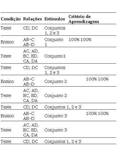 Delineamento Experimental. Foi utilizado um delineamento de linha de base múltipla entre conjuntos de estímulos, em que as relações de transitividade CD e DC para cada conjunto de três estímulos eram testadas, sem a apresentação de consequências diferenciais, antes (linha de base) e após cada fase de ensino. Além disso, as relações de simetria e de controle por cada elemento do estímulo modelo composto eram testadas após alcance de critério para o conjunto ensinado. O primeiro conjunto foi composto pelos estímulos alce, quati e raia, o segundo conjunto por corsa, cutia e tatu e o terceiro por onça, panda e gambá. A Tabela 3 apresenta a sequência experimental, demonstrando o delineamento utilizado.