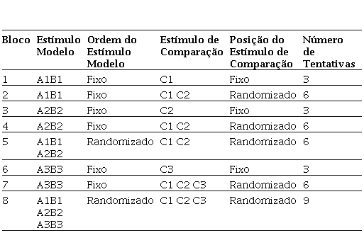 Em geral, nos blocos em que o estímulo modelo ou de comparação eram fixos (blocos 1, 2, 3, 4 e 6 da Tabela 4), o participante alcançou critério em, no máximo, três blocos; nos blocos em que modelos e comparações eram randomizados ou eram apresentados três comparações (blocos 5, 7 e 8 da Tabela 4), o participante alcançou critério depois de repetidas apresentações (ver Figura 1). Esses dados podem indicar que o participante não estava realizando, inicialmente, as discriminações sucessivas entre os estímulos modelos de uma tentativa para a seguinte ou as discriminações simultâneas entre os estímulos de comparação em cada tentativa. Segundo Green e Saunders (1998), para alcançar os requerimentos das contingências contidas em tentativas de MTS consistentemente, o participante deve discriminar entre os estímulos modelos apresentados sucessivamente através das tentativas e entre os estímulos comparações apresentados simultaneamente nas tentativas.