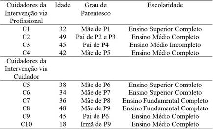 Além do treinamento prévio para implementação de ensino incidental, os aplicadores (cuidadores e profissionais) eram submetidos a um treino para aprender a estabelecer controle instrucional por meio do procedimento de Pareamento Social (Kelly et al., 2015) com as suas respectivas crianças. A seguir, a Tabela 1 apresenta a descrição de perfil dos cuidadores participantes.