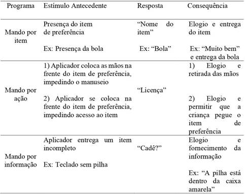 Com relação às habilidades de mando referentes aos programas de ensino, o “Mando por item” pode ser caracterizado pelo comportamento do falante em solicitar acesso a itens de interesse (e.g.: “dá bola”, “eu quero água”). No programa “Mando por ação” o objetivo é que o indivíduo realize pedidos para que o ouvinte execute ações (e.g.: “ajuda”, “pega”, “abre”, “licença”). Por último, a habilidade de “Mando por informação” ocorre quando o falante solicita uma determinada informação ao ouvinte (e.g.: “Que horas são?” “Onde está o controle?”).