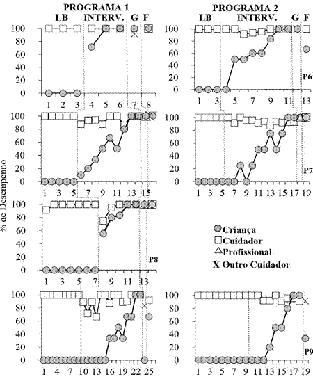 Nas Figuras 1 e 2 serão demonstrados dados referentes ao desempenho das crianças (círculo cinza preenchido) e dos aplicadores profissionais (triângulo sem preenchimento) e cuidadores (quadrado sem preenchimento ou “X”). O desempenho dos aplicadores se refere à integridade da VI (a forma como este dado foi obtido pode ser visto no subitem “Acordo entre observadores e integridade do procedimento”). As crianças que receberam intervenção via profissional foram divididas em: as que receberam intervenção pelo PR1 (P1, P2 e P3 - Figura 1- porção superior) e as que receberam intervenção pelo PR2 (P4 e P5 - Figura 1- porção inferior). O P1 teve “Mando por item” como Programa 1 e “Mando por ação” como Programa 2. De P2-P5 “Mando por ação” foi o Programa 1 e “Mando por informação” foi o Programa 2.