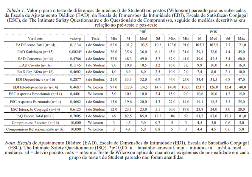Ao comparar o efeito da intervenção do pré-teste para o pós-teste, foi possível observar que a única dimensão que apresentou diferença estatisticamente significativa foi a dimensão de satisfação diádica (M=36,0 no pré-teste e M=38,0 no pós-teste, p<0,05). É possível afirmar que o programa produziu diferença estatisticamente significativa na satisfação diádica, isto é, aumentou a média da satisfação do pós-teste quando comparado ao pré-teste. O aumento da média do escore de satisfação diádica, imediatamente após o fim da intervenção, é compatível com os resultados dos estudos da área (Doss et al., 2016; Halford et al., 2017; Trillingsgaard et al., 2016).