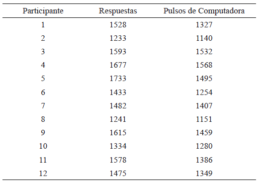 Para mostrar si el número de pulsos de la computadora se asemejó al número de R de los participantes, en la Tabla 2 se muestra el número de R de los participantes y el número de pulsos producidos por la computadora. Con todos los participantes se observó un mayor número de R que pulsos de la computadora. Dicha diferencia pudo deberse a que el equipo no produjo pulsos durante el primer bloque de 10 s ni durante la demora, mientras que las R de los participantes se siguieron registrando. Sin embargo, dichas R no podían provocar un CE, por lo que no interfirieron en el número de CE dependientes e independientes a los que se expuso a los participantes.