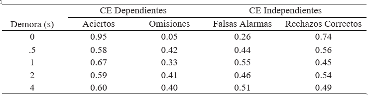 Para identificar algún sesgo en el reporte de los participantes, se analizaron las respuestas conforme a una tarea de detección de señales (Swets, 1996). Se contó un acierto (AC) cuando los participantes reportaron un CE dependiente como dependiente, una falsa alarma (FA) cuando los participantes reportaron un CE independiente como dependiente, una omisión (OM) cuando los participantes reportaron un CE dependiente como independiente, y un rechazo correcto (RC) cuando los participantes reportaron un CE independiente como independiente. Debido a que el número de CE independientes varió entre sujetos, se calcularon los porcentajes de cada tipo de respuesta por participante y, posteriormente, se promediaron estos valores. En la Tabla 3 se muestran los porcentajes de AC y OM ante los CE dependientes y los porcentajes de FA y RC ante los CE independientes obtenidos por los participantes en cada una de las demoras. El porcentaje de AC y RC más alto se obtuvo con la demora de 0 s. Después, el porcentaje de AC y RC obtenido fue cercano a 0.5, lo que indica que los participantes no discriminaron entre CE dependientes y CE independientes de su conducta. En el Apéndice B se muestran los porcentajes individuales de AC, MO, FA y RC por demora.