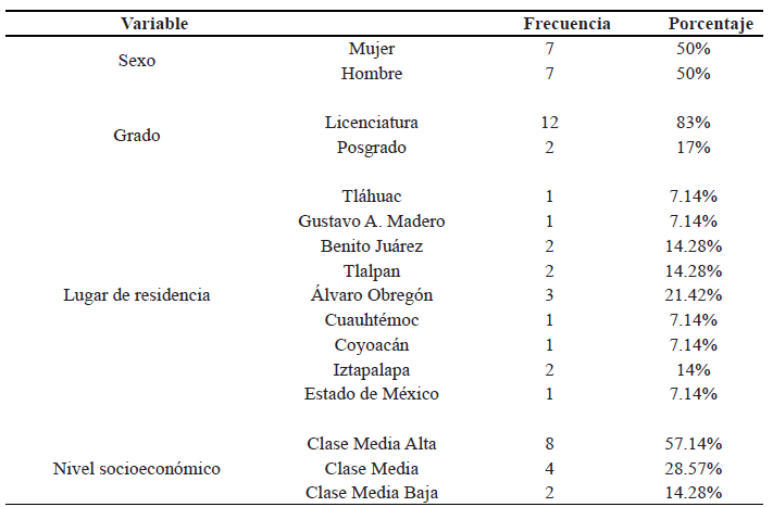 Se invitó a participar a 14 alumnos de licenciatura y posgrado de la Universidad Nacional Autónoma de México (UNAM), de entre 18 y 27 años. La mayoría de los participantes residían en la Ciudad de México. La mitad de los participantes fueron hombres y la otra mitad fueron mujeres. De acuerdo con la regla de Nivel Socioeconómico de la Asociación Mexicana de Agencias de Investigación de Mercado (AMAI) 2022, la mayoría de los participantes pertenecían a un nivel socioeconómico medio-alto. En la Tabla 1 se detallan las características de los participantes.
