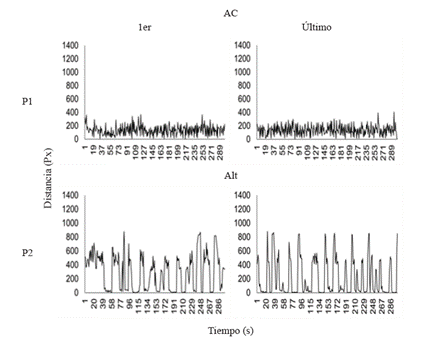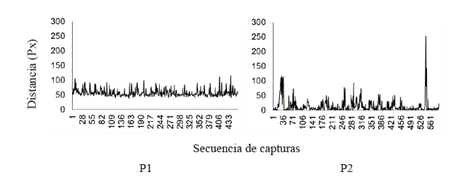 Como dato complementario al anterior, la Figura 5 representa el promedio de la distancia recorrida entre cada captura. Las distancias fueron mayores para la P1 en comparación con la P2, aunque con algunos picos que muestran incrementos momentáneos de la distancia recorrida entre capturas para esta participante.