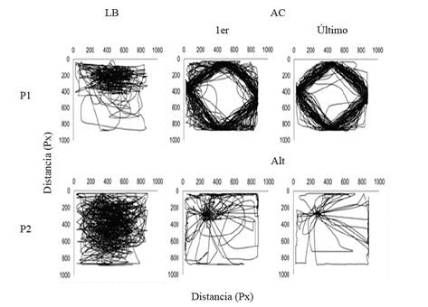 La Figura 1 representa la ruta analógica del desplazamiento de las participantes en la línea base y durante los 5 primeros y últimos minutos de la situación de acoplamiento (Participante 1 – P1) o alteración (Participante 2 – P2). En la línea base (en ausencia de objetos relevantes), se presentó variación en la ruta entre participantes. Cada participante presentó un patrón de desplazamiento diferente. La implementación de las situaciones de acoplamiento o alteración mostraron un cambio notable en la ruta de desplazamiento en comparación con la línea base. Mientras la P1 mostró una ruta en forma de rombo con trayectorias muy marcadas entre laterales, la P2 presentó una menor densidad de las rutas y una mayor concentración en la zona. Al comparar los primeros y últimos 5 minutos de las situaciones, se observó que en el caso del acoplamiento se notaron rutas más definidas mientras que en la situación de alteración pareció disminuir la densidad de las rutas tanto en la zona como en aquellas que se dirigen hacia las laterales de la pantalla.