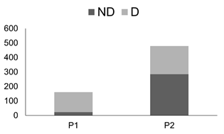 La Figura 6 representa el número y tipo de errores por fase. Se consideraron dos tipos de errores: por anticipación y por desfase. Los errores por anticipación correspondieron a los clics que ocurrieron antes de que el insecto estuviera disponible para ser atrapado. Los errores por desfase correspondieron a aquellos clics que ocurrieron después de que el insecto estuvo disponible para ser atrapado. Su identificación fue posible a partir de considerar un área de 200 px hacia adelante (anticipación) y hacia atrás (desfase) de la trayectoria del insecto (tomados a partir de su centro). El número de errores totales fue mayor en la P1 respecto la P2. Así mismo, la P1 presentó un mayor número de errores por desfase que por anticipación; por el contrario, la P2 mostró una relación inversa (más errores por anticipación que por desfase).