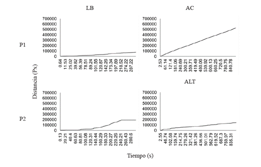 La Figura 4 representa la distancia recorrida acumulada en la línea base y en cada una de las dos situaciones (acoplamiento y alteración) para las dos participantes. La P1 mostró un incremento de la distancia total recorrida en la situación de acoplamiento respecto a la línea base. Por el contrario, la P2 no mostró un incremento de la distancia recorrida en la situación de alteración respecto a la distancia total recorrida al final de la línea base. Entre participantes, se observó una mayor distancia recorrida para la P1 que para la P2 en las situaciones de acoplamiento y alteración respectivamente.