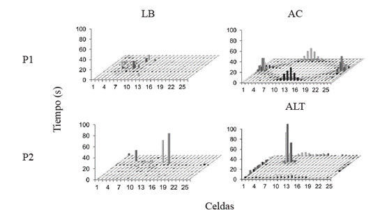 El espacio de la pantalla por el que se podían desplazar las participantes fue dividido en un mallado virtual (no visible para las participantes) de 25x25. Cada celda resultante del mallado tuvo unas dimensiones aproximadas de 49x49 px. Se calculó el tiempo total acumulado de permanencia en cada una de las celdas el cual se representa en la Figura 7. Durante las situaciones de acoplamiento y alteración, la distribución del tiempo acumulado fue diferencial entre participantes. La P1 mostró tiempos de permanencia mayores en el centro de las cuatro laterales de la pantalla mientras que la P2 mostró una concentración de la permanencia principalmente en el área donde se ubicó la zona seguido de una permanencia distribuida en el centro de las laterales.