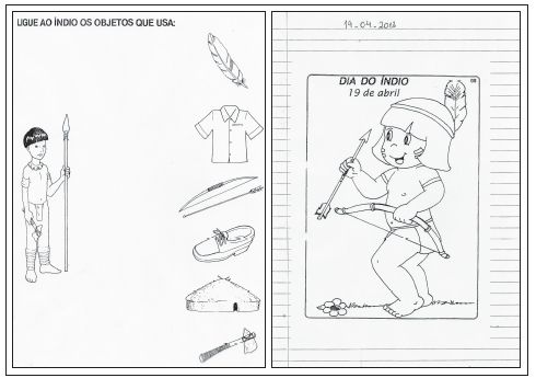 Voltando às respostas dos professores, quando questionados sobre as principais fontes de informação utilizadas para pesquisar sobre os povos indígenas brasileiros em suas aulas, foram citados, por ordem de frequência: material coletado na internet, notícias da mídia e livros didáticos. Porém, como exemplificado em um dos depoimentos citados anteriormente, sem formação anterior ou maior conhecimento sobre o assunto, o uso dessas três fontes parece ser bastante acrítico: uso de palavras-chave, como "Dia do Índio" ou "Índio", para encontrarem exercícios e atividades que costumam reforçar estereótipos e preconceitos sobre essas populações. Abaixo, alguns exemplos de materiais facilmente encontrados na internet, utilizados por professores da educação básica no país.