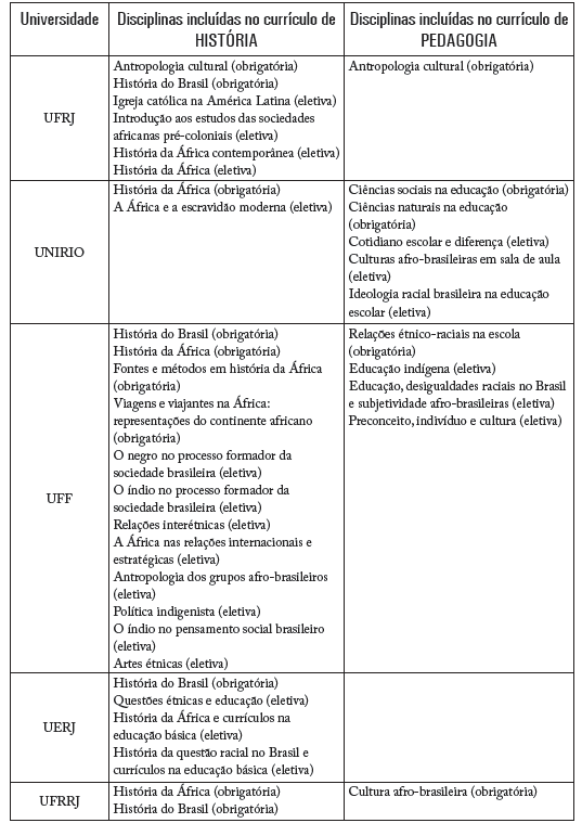 Sobre o currículo das faculdades, a pesquisa realizada entre março e maio de 2013 procurou - por meio dos sites das universidades - os currículos dos cursos de história e de pedagogia nas cinco principais universidades públicas do estado do Rio de Janeiro. Com base nessa pesquisa, organizamos os dados apresentados no Quadro 1.