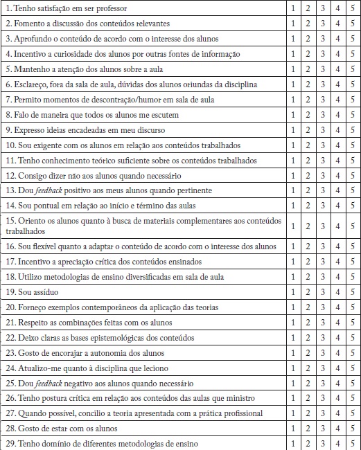 Para a construção da escala, foi realizada uma revisão da literatura com base na qual se definiram as três dimensões que comporiam o instrumento: quem é o bom professor, o que sabe o bom professor e como faz o bom professor. Ainda, foram realizadas entrevistas com alunos de graduação para o levantamento dos aspectos que definem o bom professor. Para as entrevistas, foram contatados estudantes de diferentes cursos de graduação de universidades públicas e privadas de três estados do Brasil: Rio Grande do Sul, Minas Gerais e Ceará. Elas ocorreram pessoalmente ou por e-mail, e os alunos foram solicitados a descrever um bom professor de graduação, considerando suas habilidades e competências. Participaram dessa etapa 22 estudantes de graduação. O número de entrevistas foi determinado de acordo com o critério de saturação, ou seja, elas foram finalizadas quando os estudantes começaram a repetir as descrições de bons professores (Fontanella; Ricas; Turato, 2008).