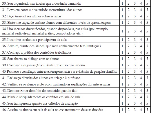 Assim, tendo em vista a variabilidade e a complexidade dos aspectos mencionados nas dimensões anteriores, é importante lançar mão de medidas psicometricamente válidas capazes de mensurar esse construto. Nesse contexto, Avrichir e Dewes (2006) desenvolveram um dos instrumentos existentes para autoavaliação do desempenho docente para professores de graduação. Trata-se de uma escala destinada a avaliar dois fatores: