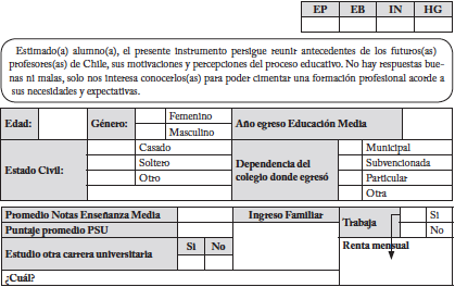 La interrogante por las motivaciones profesionales, las características socioeducativas y por la percepción que existe sobre la coyuntura del sistema educativo nacional, constituye un factor determinante si se considera el posterior rendimiento académico, la vocación y el desempeño laboral que puedan practicar los futuros egresados de la carrera docente. Asimismo, este tipo de indagaciones nos permite - en tanto profesionales dedicados a la educación - considerar un panorama crítico que es evidenciado por el instrumento aplicado (encuesta) a un universo específico de estudio. Esta situación permitirá una orientación más clara del tipo de intervención formativa que el y la docente debiese tomar en cuenta al momento de analizar y aplicar sus instrumentos de aprendizaje (planificación curricular, didáctica, modelo formativo, etc.) en el aula universitaria.