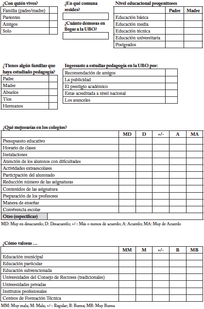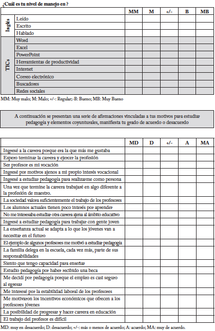 Para recoger la información se diseñó un cuestionario estructurado en tres partes: la primera de ellas recogía datos socioeducativos de los y las estudiantes, en la segunda se solicitaba la opinión respecto a diferentes aspectos del sistema educativo nacional y, finalmente, se contempló una escala de “Motivación hacia estudios del Magisterio” desarrollada por García Garduño y Organista (2006), la cual permite identificar el tipo de motivación que determinó la elección de la carrera.