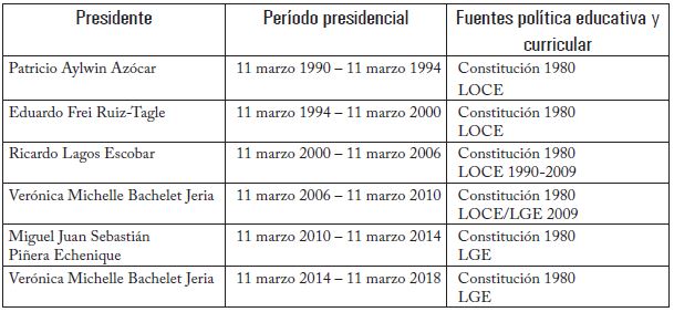 En marzo de 1990 asume el poder la Concertación de Partidos por la Democracia, coalición de partidos políticos de centroizquierda. Su gobierno se extiende hasta el 2009, donde la Coalición por el Cambio, conglomerado de derecha, encabezado por Sebastián Piñera, gobierna hasta marzo de 2014, fecha de inicio del segundo período presidencial de Michelle Bachelet. A partir de 1996, se inicia una reforma educativa que comprende una reforma del currículum y la implementación de la jornada escolar completa. Ésta queda regulada por el Marco Curricular Nacional.