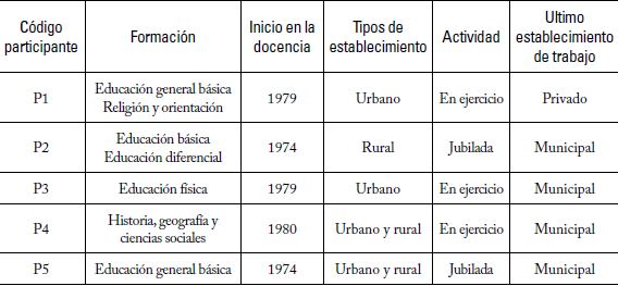 Las profesoras entrevistadas viven actualmente en la región del Maule y ejercieron gran parte de su carrera profesional en esta misma región. Todas ellas comenzaron a trabajar como docentes siendo muy jóvenes, aproximadamente a los veinte años de edad, y debutaron en la profesión como reemplazantes. Las profesoras 1, 3 y 5 trabajaron en diferentes establecimientos, rurales, urbanos, municipales y privados subvencionados por el Estado. Mientras que las profesoras 2 y 4 permanecieron durante casi toda su carrera en un mismo establecimiento educacional público. Si bien, tres de ellas encontraron tempranamente una estabilidad laboral, todas ellas estuvieron sujetas a variaciones contractuales que variaban su renta. Cuatro de las cinco profesoras trabajaron durante varios años en más de un establecimiento escolar para poder complementar sus ingresos.