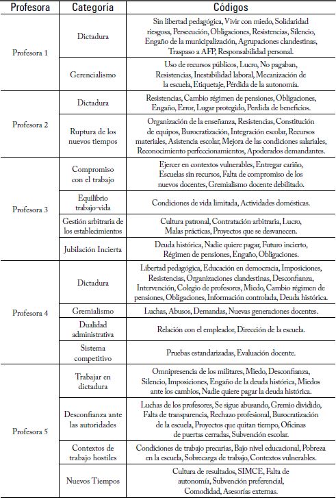 A continuación, se presentan en la Tabla 2 las categorías y los códigos que emergen del trabajo de codificación de cada una de las profesoras participantes del estudio.