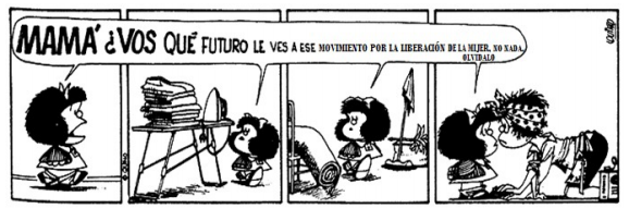 Em um segundo momento, apresentamos algumas tirinhas de Mafalda, do cartunista argentino Joaquín Salvador Lavado Tejón, o Quino. Como atividade de contextualização, expusemos a nacionalidade do produtor das tirinhas, de modo a, além de situar o espaço delegado ao feminino em outro país, suscitar questionamentos sobre possíveis semelhanças (ou diferenças) com a realidade cultural brasileira. Considerada por muitos como transgressora, Mafalda, representada por uma criança, é uma personagem que costuma trazer muitas reflexões acerca das normas regulatórias que definem o que é apropriado ao feminino. Não raro, tece críticas à maneira como sua mãe e sua amiga Susanita reforçam representações normativas de dominação patriarcal. A Figura 1 traz uma das tirinhas de Mafalda3 que utilizamos em nosso projeto de intervenção: