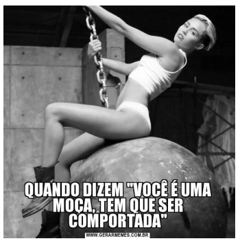 Nesse exemplo, a imagem da famosa cantora e atriz norte-americana Miley Cyrus, vestida de branco5 e agarrada a uma bola de demolição, é apresentada em segundo plano, ao que se sobrepõe a escrita “Quando dizem ‘você é uma moça, tem que ser comportada’”. Em conjunto e por contraste, a imagem e os escritos remetem aos comportamentos relacionados tradicionalmente ao feminino e apreensíveis da reportagem “Bela, recatada e ‘do lar’”, discutida com os alunos durante o projeto de ensino desta pesquisa. São os escritos que orientam primeiramente essa compreensão, por estarem em primeiro plano e por focalizarem a ideia de que a mulher teria de ser comportada, mas é somente pela junção entre a imagem e a escrita selecionadas para a produção do meme que esta última se revela em seu caráter irônico. Em contraposição à pressuposta mulher recatada, a imagem da cantora faz alusão à mulher ousada e questiona a vigilância moral do comportamento feminino, ressignificando o estereótipo de mulher recatada, ainda muito presente na contemporaneidade, como mostrou a citada reportagem.