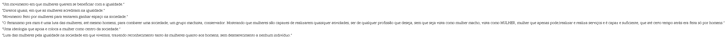 Reunidas as respostas, realizamos a primeira análise das informações geradas, que nos permitiram pensar sobre quais atividades poderiam ser propostas para a intervenção/o projeto de ensino - entendido aqui como período de reflexão, debates, leitura e produção de textos referentes à temática abordada. No intuito de ilustrar as primeiras considerações dos estudantes a respeito da questão, apresentamos no Quadro 1 um recorte ipsis litteris de seis respostas que consideramos representativas das demais que se seguiram à pergunta-chave sobre o que é feminismo.
