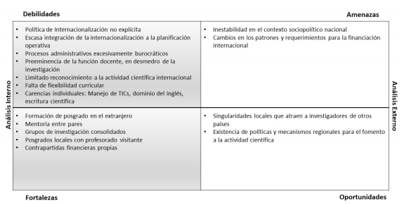 En cuanto a los factores externos, se sistematizan algunas oportunidades favorables del entorno que podrían aprovecharse para potenciar la actividad científica transnacional; se considera que las singularidades del contexto local son un factor que puede atraer iniciativas de colaboración científica con académicos en otros países y que la integración con las políticas y mecanismos regionales para el fortalecimiento de la actividad investigadora sirve al fortalecimiento de la internacionalización universitaria. Finalmente, se identifican ciertas amenazas a la colaboración internacional; factores externos como la inestabilidad sociopolítica del país que podría desalentar la movilidad o asocio con actores nacionales o los cambios en los patrones de financiamiento internacional que puedan afectar negativamente a las iniciativas internacionales de investigación deben ser tenidos en cuenta para la formulación de estrategias de afrontamiento orientadas a aminorar sus efectos.