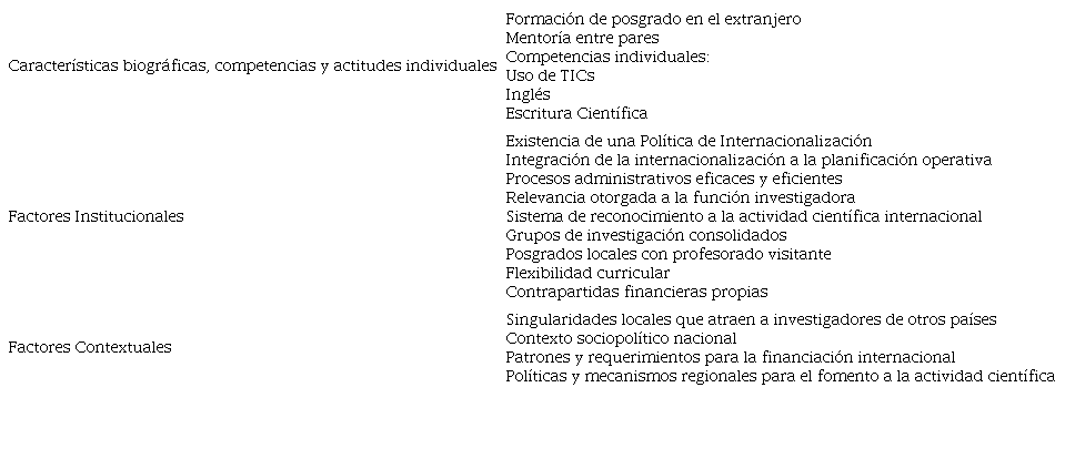 Paz y Sarthou (2015) establecen algunos factores contextuales que provocan una mayor internacionalización de la investigación en las universidades, entre los que cabe mencionar: 1. El desarrollo de las disciplinas tiende hacia una mayor especialización y a una creciente relevancia de la interdisciplinariedad; 2. Las nuevas modalidades de financiamiento de la investigación; 3. La reducción de los costos de movilidad y comunicación; y 4. La creación de espacios supranacionales y de estímulos para la integración entre países. Rostan y Ceravolo (2015) dividen en tres grupos estos factores que inciden sobre la intensidad de la colaboración internacional en la investigación científica: características biográficas individuales, tanto atribuidas como adquiridas; factores organizacionales y profesionales vinculados al tipo de institución de adscripción, la experiencia del investigador y etapa de la carrera profesional (rango académico); y rasgos estructurales que caracterizan el contexto más amplio en el que se realizan las actividades de investigación, como, por ejemplo, las características del país de residencia.