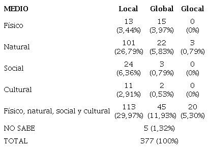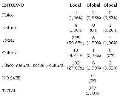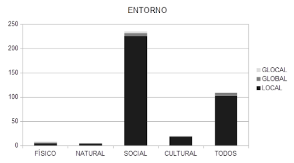 La sistematización de los datos se ha generado a partir del análisis de las dimensiones físico, natural, social y cultural y su apreciación en el ámbito local, global o glocal. Respecto al entorno (Cuadro 2), los resultados obtenidos muestran indicios de una conceptualización desde la dimensión social en más de la mitad de los casos, seguido por algo más de una cuarta parte por los que representan una apreciación de la dimensión físico/natural y socio/cultural en el ámbito del medio local. Las representaciones globales y glocales son poco significativas.