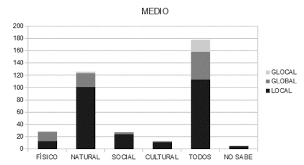 En lo referente al medio (Cuadro 3), los datos muestran una representación social del concepto como medio (ambiente) natural en algo más de la cuarta parte de la muestra. En aproximadamente el 30% de los casos, el alumnado es capaz de apreciar todas las dimensiones (físico, natural, social y cultural), pero el medio se muestra de manera predominante como un escenario local más general, que los estudiantes denominan “global”, pero que representan de manera local. En la representación del entorno se incrementan los ejemplos globales (referidos al planeta) y las glocales (de conexión entre lo local y lo global) con respecto a lo que sucedía en las representaciones del entorno.