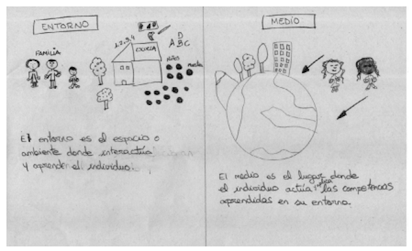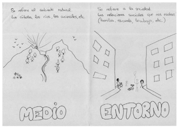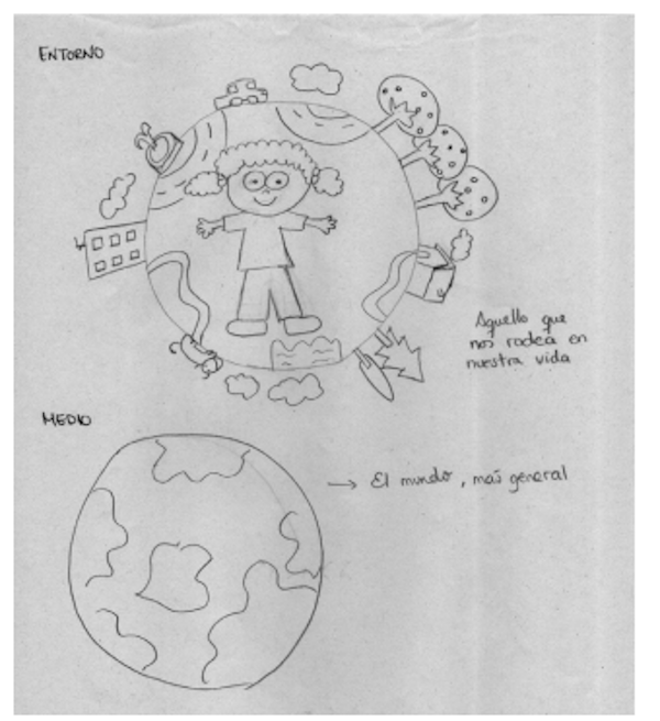 Los dibujos se ajustan a los estudios de percepción geográfica aplicados al campo de la didáctica (Castro, 1997; Lerma, 2013). El conocimiento de las representaciones sociales de Castro y Bosque (1991) permitió la adaptación de los métodos de la geografía de la percepción y del comportamiento hacia el conocimiento del espacio subjetivo mediante el uso de mapas mentales. Los mapas mentales son de menor complejidad cognitiva que las imágenes mentales (Caneto, 2000) y plasman la representación del espacio subjetivo y la reproducción del valor simbólico que cada sujeto atribuye a ese espacio. En nuestro caso, el objeto de estudio son las representaciones de los conceptos entorno y medio, que, por su calidad, se asemejan más al concepto “esbozo de mapas”, croquis o dibujos menos elaborados, que se realizan de manera espontánea (Escobar, 1992).