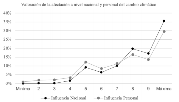 Los ítems 38 y 39 indagan en la percepción del riesgo a través de la valoración del grado en que el CC puede afectar a Brasil y a nivel personal. La escala de 1 a 10 equivale a 1 «ninguna afectación» y 10 «mucha afectación». Se obtienen los siguientes descriptivos a nivel estatal: media = 8,29, mediana = 9 y moda = 10; y a nivel personal: M = 7,66, Me = 8 y Mo = 10. El Gráfico 2 ofrece la distribución de frecuencias de ambos ítems comparados. La prueba de contraste no ofrece significación estadística en ninguna de las variables de contraste.