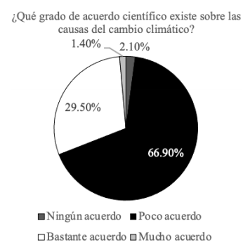 Encontramos así que, en el contexto mexicano, González-Gaudiano y Maldonado-González (2014, p. 43) sugieren que entre los estudiantes de la Universidad Veracruzana emerge un “[…] primer pensamiento […] más relacionado con las consecuencias del fenómeno que con sus causas. Es así que privilegian pensamientos relacionados con cambio y variabilidad climática […]”. Por otro lado, apuntan a que los jóvenes no consideran el CC como uno de los dos problemas más importantes a nivel mundial, nacional, estatal y/o municipal. En Europa, Almeida, García Fernández y Sánchez Emeterio (2016) realizaron un estudio comparado sobre las relaciones existentes entre el sistema ganadero y el CC con estudiantes que cursaban la titulación de maestro de Educación Primaria en España y Portugal. Las autoras concluyen que, en ambos países, los estudiantes universitarios infravaloran el impacto que la ganadería tiene sobre el CC. Igualmente confirman la permanencia de la concepción errónea que vincula la degradación de la capa de ozono y el CC que ya se detectó 2 décadas atrás (Boyes y Stanisstreet, 1992), que persiste (Kerr y Walz, 2007) y que se ha corroborado en recientes estudios con universitarios de España (García-Vinuesa et al., 2019; 2020). Jamelske et al. (2015) realizaron otro estudio comparado con estudiantes universitarios de Estados Unidos y China donde una mayor proporción de estudiantes chinos aceptan la existencia del CC (87,2%) y sus causas antropogénicas (86,4%,) en comparación con los estudiantes estadounidenses (76,8% y 59%, respectivamente). Los investigadores sugieren que la presencia de un fuerte lobby negacionista en Estados Unidos genera incertidumbre y teorías de la conspiración que parecen influir en la creencia de su origen y en la aceptación del CC (Jolley y Douglas, 2013).