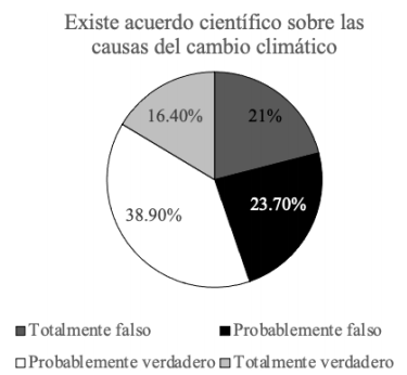 La convivencia entre información contradictoria dentro de la representación del CC emerge una vez más en la incertidumbre que genera el consenso científico sobre las causas antropogénicas del CC o en la declaración de que el CC es producto de la variabilidad climática y que podría tener incidencia en la percepción de la responsabilidad percibida.